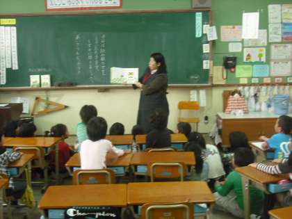 今日は図書ボランティアさんによる「読み聞かせ」です。みんな,集中して聞いています。子どもたちは読み聞かせが大好きです。