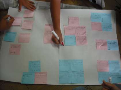 自分で取り組んだエコについて,できたこと,できなかったことを青とピンクの付箋に書き込み,グループで話し合いを進めながら,仲間わけをしています。そして,これから取り組んでいけること,取り組まないといけないことを話し合いました。1人1人が環境についてしっかり考え行動すれば,美しく豊かな自然の地球は守られることでしょう。