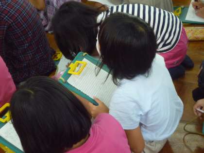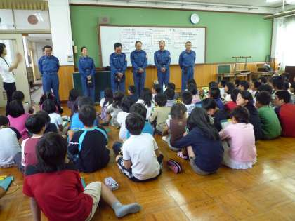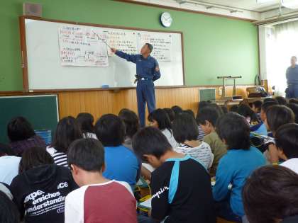 社会科では、町を守る仕事について勉強しています。今日は、待鳳消防分団の方々に来ていただき、消防分団のお仕事について教えていただきました。最初は、部屋の中で、消防分団の歴史や組織、そして、実際の仕事の中身などを教えていただきました。お話を真剣なまなざしで聞きながら、一生懸命にメモをとる4年生の子どもたちでした。