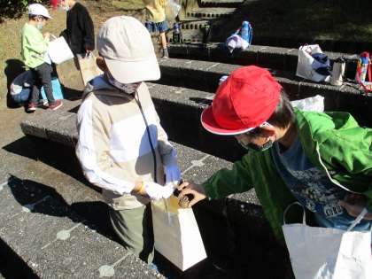 「松ぼっくりも見つけたよ。はい,どうぞ。」と分けてくれる優しい友だちもいました。
