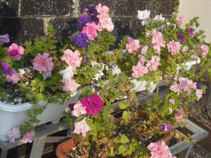 夏の花,八重のペチュニアが玄関で頑張って長く咲いています。