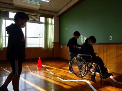 各教室に6つのブースを作り,3年生を招待した活動では,「車いす体験」「アイマスク体験」「点字体験」「手話体験」「福祉マーククイズコーナー」「福祉マップ紹介コーナー」を用意しました。3年生に学習したことを,いかに分かりやすく伝えるか,この日に備えてグループでたくさん話し合い準備を重ねてきました。