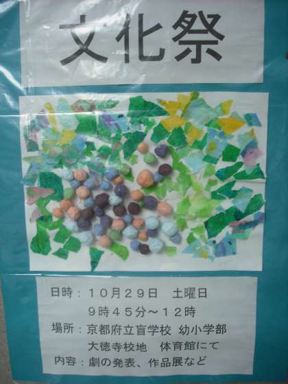 いつも,交流している京都府立盲学校から文化祭のポスターが届きました。ぜひ文化祭をご参観ください。劇や作品展があります。