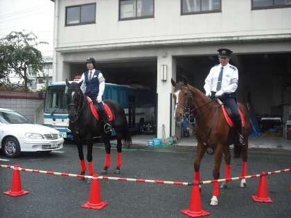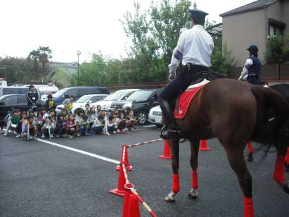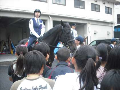 平安騎馬隊の馬と一緒に学校までパレードをして学校まで帰ってくる予定でしたが,天気の状況で中止となりました。残念です。でも,平安騎馬隊の馬をみせてもらって,どんな仕事をしているか教えていただきました。