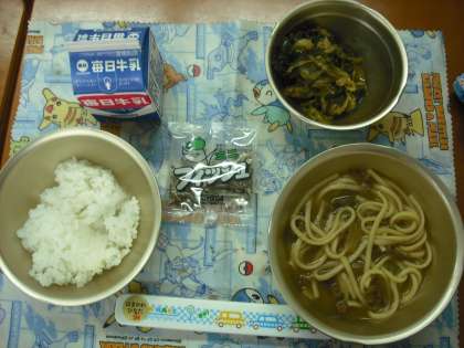 今日の給食は「カレーうどん」です。みんなの大好物です。おかわりをしたくてしたくてたまりません。
