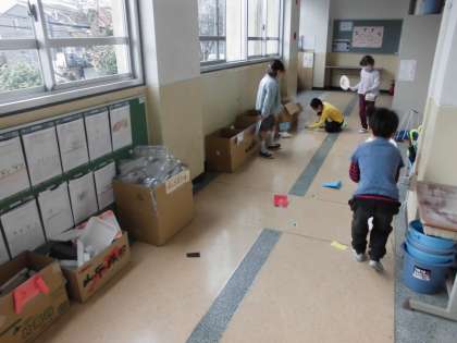 それぞれに,試行錯誤し,アドバイスをし合いながら,よりよい遊びになるように工夫しています。みんなで,アイディアを出し合って,楽しい「動くおもちゃフェスティバル」にしていきます。