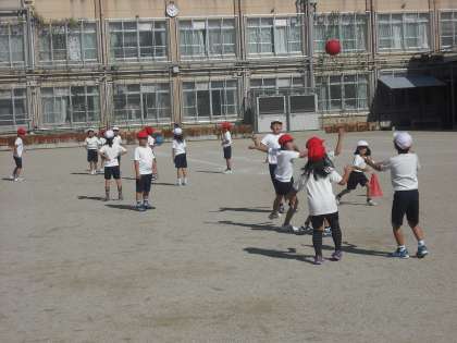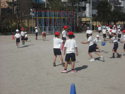 秋晴れのもと,2年生が「パスゲーム」をしています。みんな元気に走り回っています。