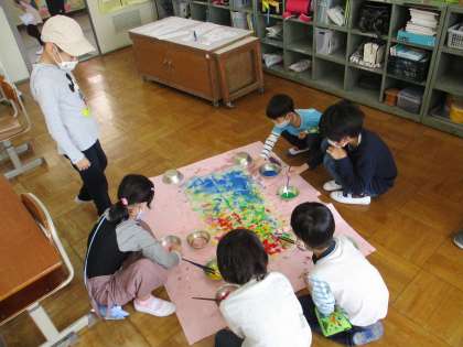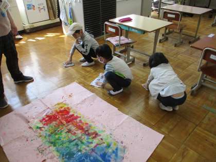 いろいろな色がにじんだり,混ざったりしてできる模様を,みんなとても楽しんでいました。