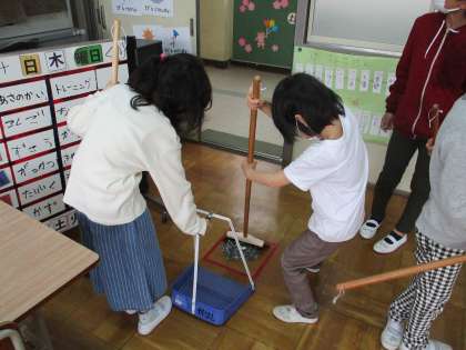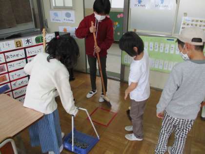 6年生のリーダーが,ほうきの使い方や,ちりとりでのごみの集め方のお手本を見せると,下級生もそれをまねて上手に掃除ができていました。