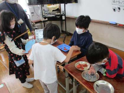 魚を釣る人,長さを測る人,魚を売る人に分かれて,役割を交代しながら,長さの計測や読み方,硬貨での代金の払い方などを学習しています。