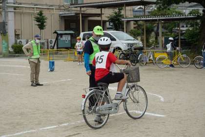 子どもたちは,ブレーキのかけ方や安全確認の仕方などを教わった後に実際に自転車に乗って体験しました。最後には,地域の方やPTAの方,警察官の方に見ていただきながら実技のテストを受けました。子どもたちは緊張した面持ちの中,安全に気をつけながら一生懸命自転車を運転していました。