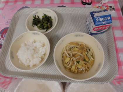 「カレーうどん」は,鶏肉・油あげ・たまねぎの具がたくさん入っています。子どもたちは,美味しそうに食べていました。