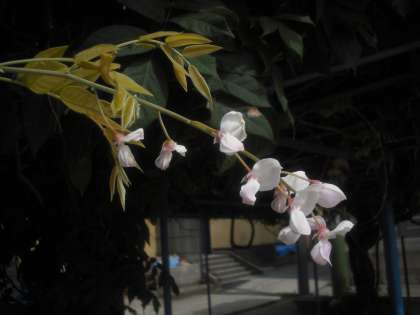 藤のツルを切った後から出てきた新芽に,季節はずれ?の「藤」の花が咲いています。淡いピンク色です。どうしたのでしょう?