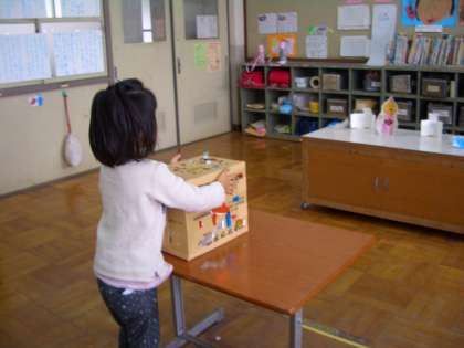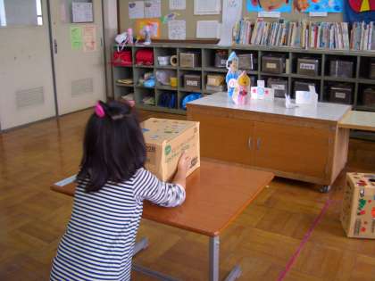 科学センター学習の中で遊んだ「空気砲」を,自分たちで作って遊びました。段ボール箱に丸い穴をあけて,両手で段ボール箱をたたくと,目に見えない空気が飛びだし,うまく的に当てることができました。とても楽しかったよ。