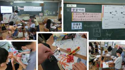 今日は,電池2個を直列つなぎをしたときに,なぜ豆電球の明かりが明るくなるのか,モーターが速く回るのかを考えました。