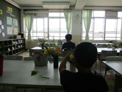 学校の北グリーンベルトを教職員で整備しました。そこにある学校の植物で身近な自然を感じたいと,環境美化隊や六年生有志がいけばな活動に取り組みました。