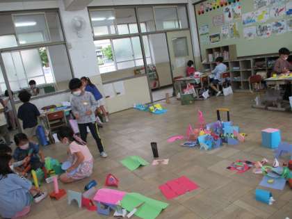 図画工作科では,「おってたてたら」の学習をしました。紙を折って立つ仕組みを使って,「おってたつわくわくランド」を作りました。