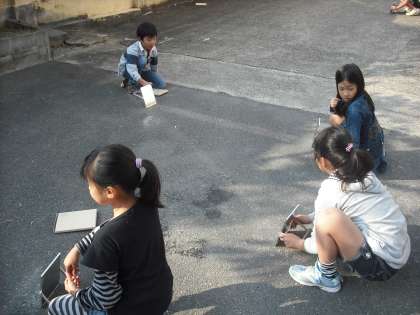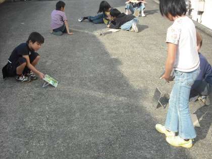 鏡で反射させた太陽の光の道筋が地面に映るようにして,光の進む様子を調べています。