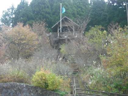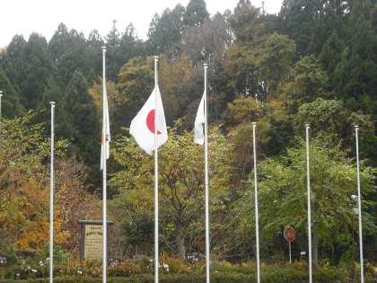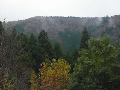外気温は10度,バスを降りた子どもたちからは「さむっ」の声が。紅葉も進んでいます。山には霧がかかっています。少しの時雨はあるかもしれません。