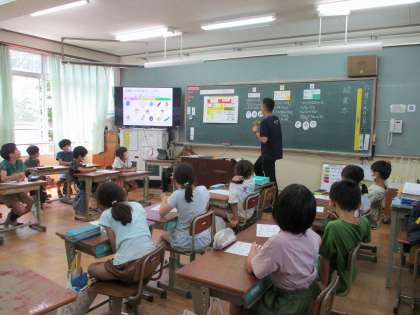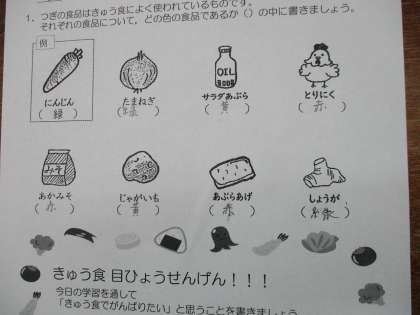 1組は先週,2組は今週,栄養教諭の高橋先生に「食べ物の3つの仲間」について教えていただきました。給食に出てくる食材が,それぞれ「体をつくる」「熱や力のもとになる」「体の調子を整える」のどの仲間に分類されるのか,それぞれ体にとってどんなよいはらたきをするのかを考えました。子どもたちは,「この食材はどの仲間になるんだろう」と一生懸命考えており,3つの仲間をバランスよく食べることが大切だと気付いていました。給食や日々の食事でも,バランスを大切にして食べられるようにしていきたいですね。