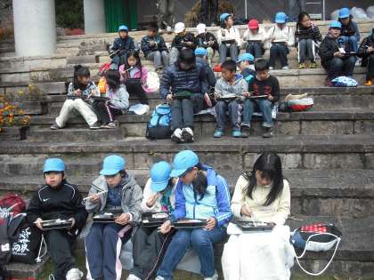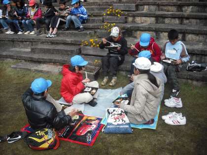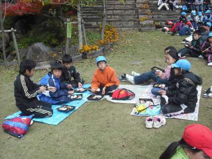 山歩きの時間はグループによって違いますが,1時間30分から2時間ほど歩きました。さすがにちょっと疲れた様子でしたが,昼食と聞くと,みんなうれしそうです。一緒に山歩きをした3校のグループでキャンプファイヤーの出し物を考えながら楽しく食事をしました。