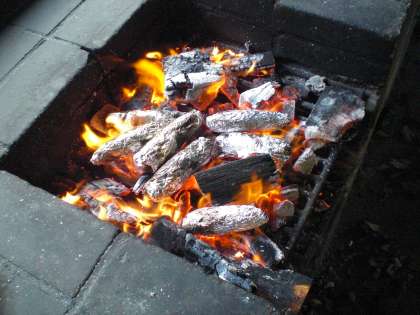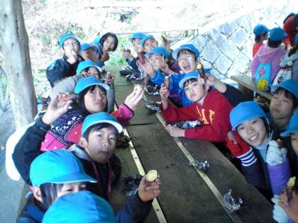 スコアオリエンテーリングの合間に火おこし・おやつ作りをしました。先生の協力を得ながら何とかかまどに火をつけることができました。いい感じのおき火になったところで,さつまいも投入!とてもおいしいほっかほかの見事な焼いもができました。いただきます。