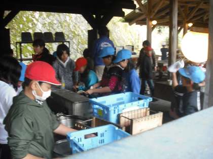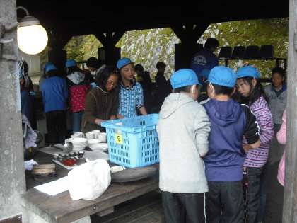 みんなで協力して,まずは調理に使う道具をきれいに洗って消毒しています。