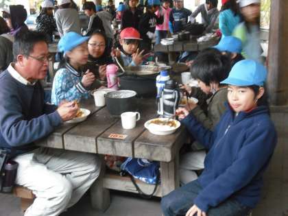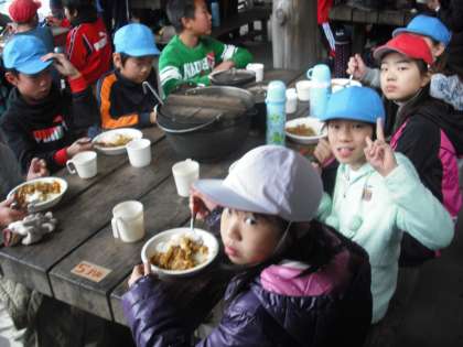 みんなで協力して作ったカレーライスやハヤシライスをいただきます。味は最高です。「家のカレーよりおいしい」という声があちらこちらから聞こえてきました。それもそのはず,まず,自分たちで作ったという,また,仲間と協力して作ったという最高の調味料が入っているのですから。