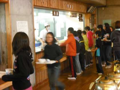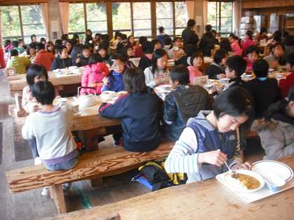 とうとう山の家での食事も最後になりました。昼食では丼にこだわった子,麺類にこだわった子,カレーライスにこだわった子,うまく食べわけてる子とさまざまでした。今日は丼派が多かったようです。でも,5日間通して子どもたちの食欲にはびっくりです。