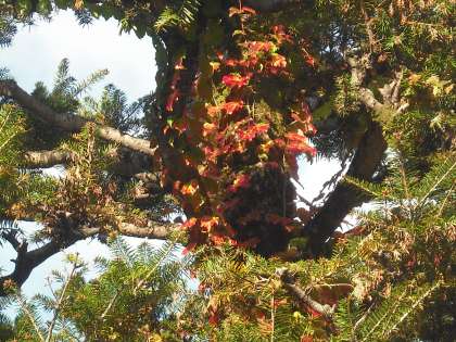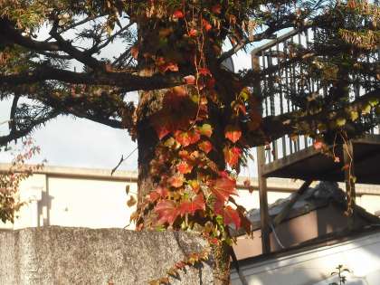晩秋の近づいてきましたね。校門のモミの木に絡まっている蔦が赤さを増してきました。