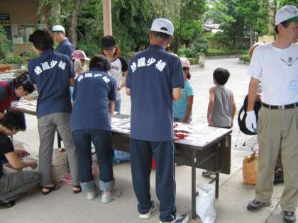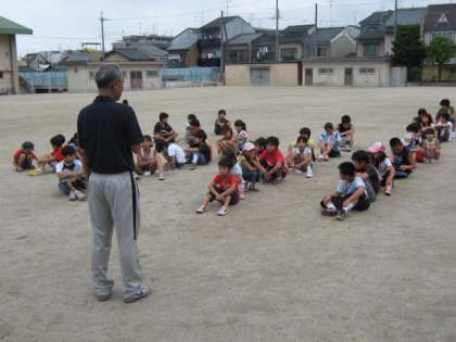 大きなリュックを背負って,子どもたちが集まってきました。たて割りのグループに分かれて,いよいよお泊り会の始まりです。開会式では,少年補導の旗を揚げました。