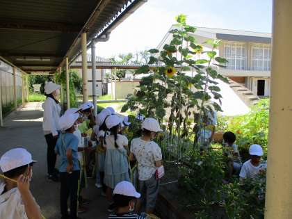 1学期に植えた種が、花を咲かせました。オジギソウ・フウセンカズラ・ヒマワリ・マリーゴールド・オシロイバナが、夏休みの間に、ぐんぐん育っていて、びっくりしました。