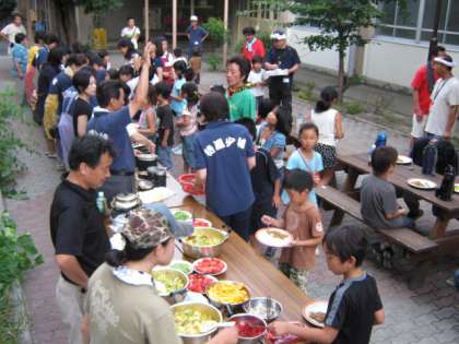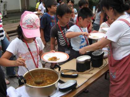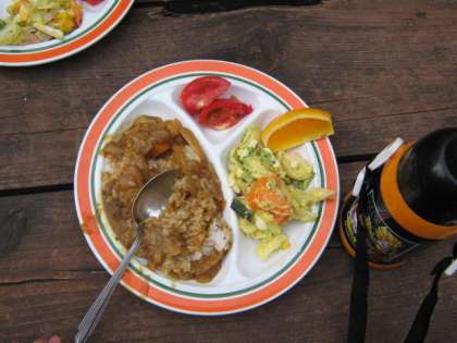 ごはんも炊き上がり,いよいよ夕食です。班ごとに,カレーの具やルーもちがうので,どこの班のカレーがおいしいか,食べ比べたりしながら,にぎやかな夕食となりました。