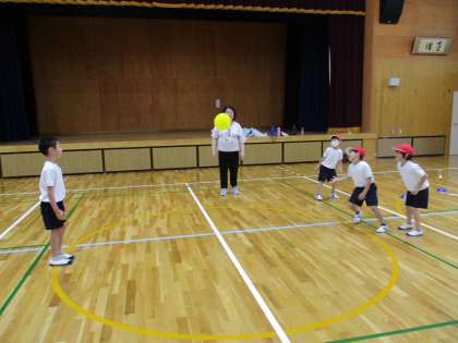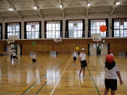 体育の学習では、風船を使って、みんなでバレーボールのように打ち合って楽しんでいます。