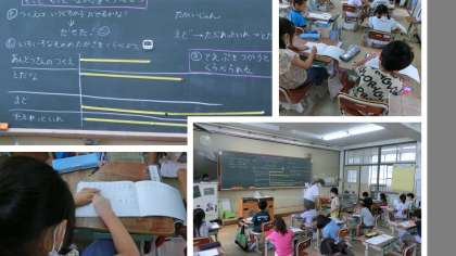 1年生に入っている実習生が、算数の授業をしました。テープを使って長さ比べをする楽しい授業でした。