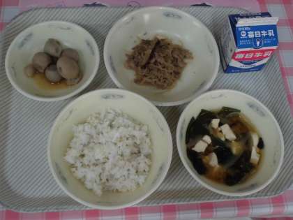 今年の十五夜は、9月10日です。十五夜には秋の実りに感謝して、すすきやだんご・里芋などをおそなえして月見をします。今日は、その里芋を使った献立が出ています。