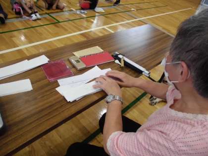 子どもたちは今までに、点字や手引について学習し、視覚障害についての認識を深めてきました。今日は、子どもたちが打った点字をゲストティーチャーに読んでいただいたり、手引のお手本を見せていただいたりして、学習をより深めることができました。