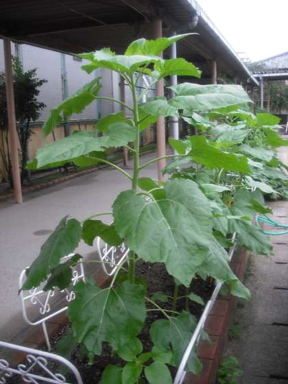 「姫ヒマワリ」はかわいい花を咲かせています。「ロシアヒマワリ」はまだ花が咲いていませんが,大人の背丈位まで伸びてきました。