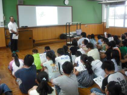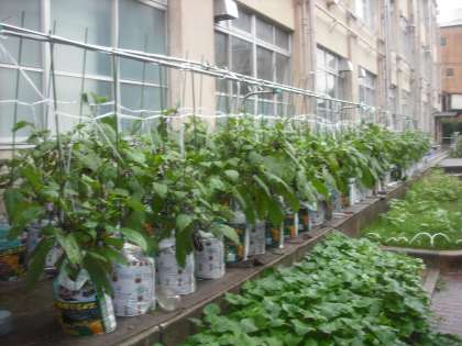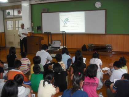 夏休みを前に,食育・農育としては最後の授業がありました。ここまで大きく育つと,9月までナスビがとれます。夏休みの間の水やりをしっかりしましょう。
