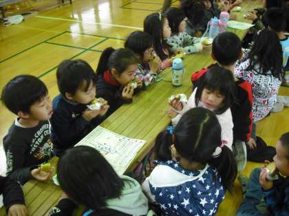 さあ,いよいよ「おいもパーティー」です。2年生が収穫したサツマイモは164個もあったそうです。朝からPTAの方が作ってくれていたふかしいもをみんなでいただきます。とても甘くおいしいふかしいもでした。おかわりがあるのか心配している子がたくさんいました。