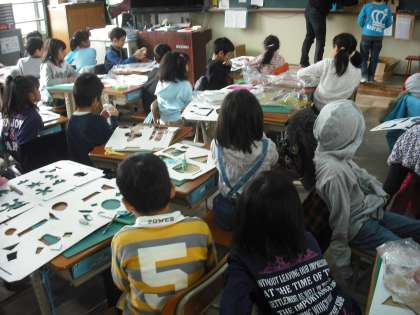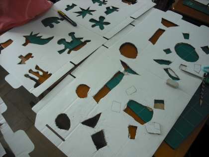 いろいろな世界を表現したダンボールがくりぬけました。いよいよカラーセロハンを張っていきます。出来上がりが楽しみですね。