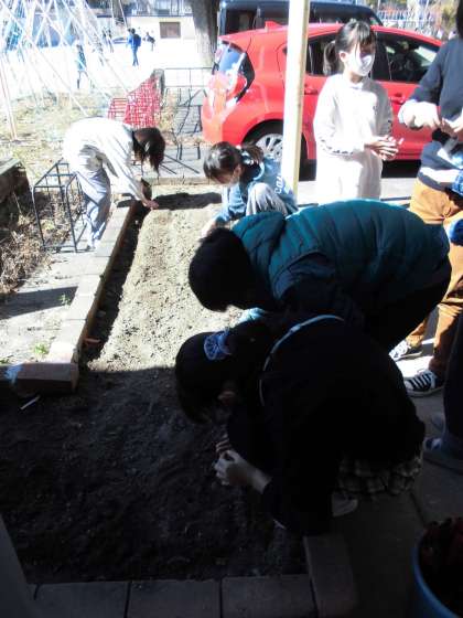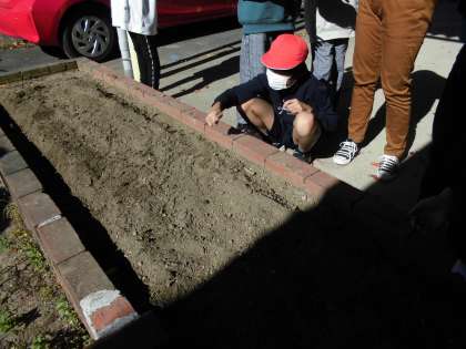 今日の中間休みに、学校環境美化隊の子どもたちが、花壇に菜の花の種をまきました。