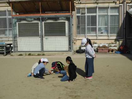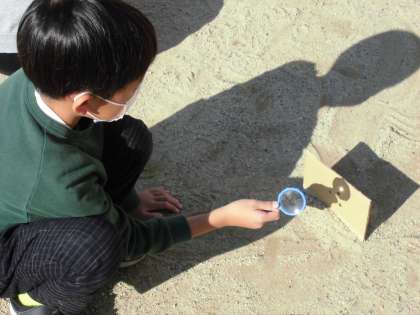 今日もいい天気だったので、運動場で光を集め、光点に熱が発生することを実験で確認しました。コツがいるのですが、子どもたちはすぐさまコツをつかみ、ダンボールをこがしていました。