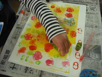 ローラーなどを使って下地をつくり,身近にあるものを使ってスタンプ形式でペッタンペッタン押していきます。素敵な形が浮かび上がってきます。