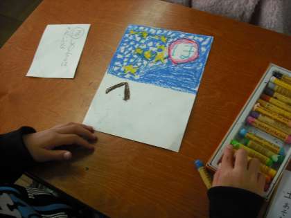 「ふゆ」から連想する言葉を集め,かるたを作ります。まず,かるたの読み札の文を作り,その様子がわかる絵札も作ります。かるた大会が楽しみだね。