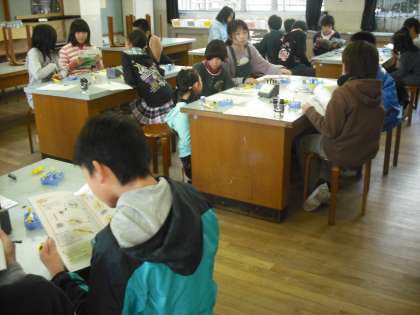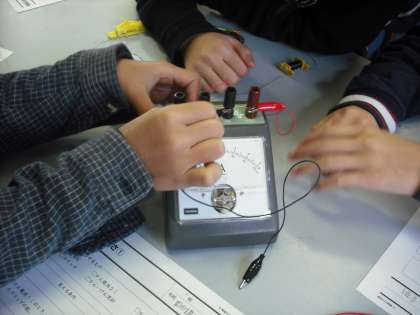 今日は電流計を使って電磁石の強さと流れる電流の大きさを調べています。電流計は初めて使うので,使い方も学習しています。