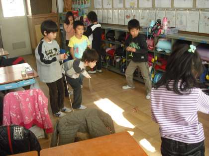 1年生が,先ほど色付けしたこまで,お正月にちなんだ昔の遊び,こままわしに挑戦です。ところが,経験がないのか,ひもの巻付け方も知らずなかなか回すことができない子も多くいます。何回も何回も挑戦してると上手に回せるようになるよ。中にはバケツの裏を狙ってこまを回す子もいます。