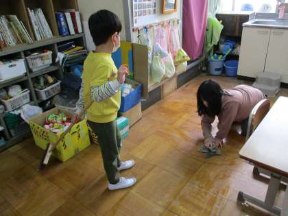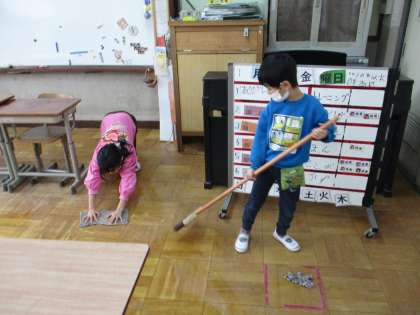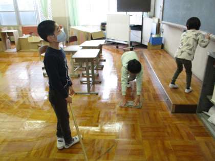 ある日の掃除時間、自分たちで役割分担を相談して、サッサと掃除を始めている子どもたち。床を見ると、いつも以上にピッカピカです!