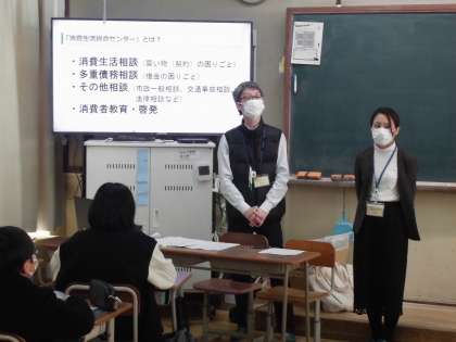 京都市消費生活総合センターからゲストティーチャーをお招きして、エシカル消費はどのような現状なのかお話をしていただきました。「エシカル消費」は難しいことのように感じている人も多いですが、実は自分たちですぐに取り組めることがたくさんあるのだということや、一人でも多くの人に知り、取り組んでもらうためにされていることについて教えていただきました。