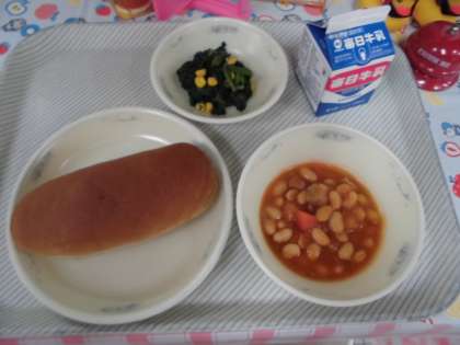 「ポークビーンズ」は、大豆・豚肉・野菜をじっくり煮込んだトマト味の献立です。パンと一緒に味わって食べました。